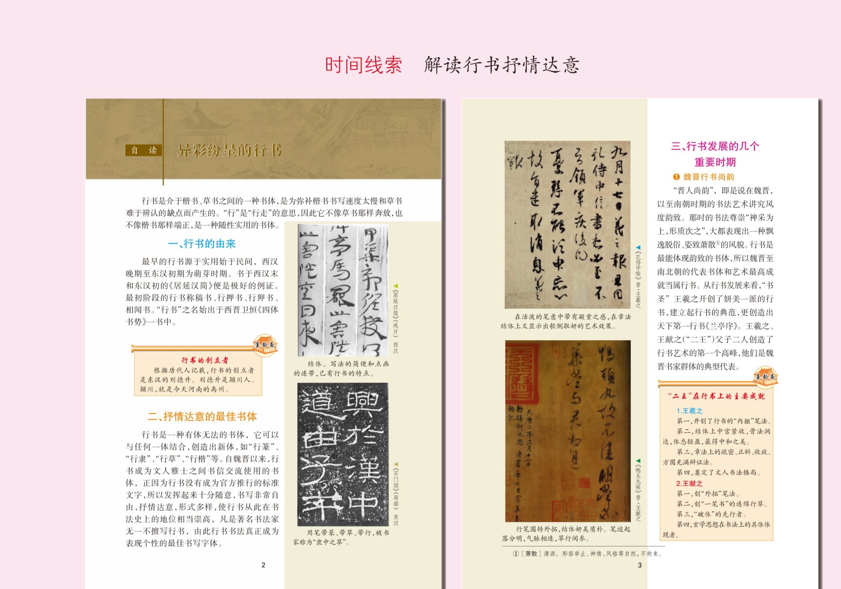 本套教材结合初中生的特点,突出经典导向,坚持守正原则,以美育人,以神动人,无论是对不同书体发展历程的深入浅出的讲解,还是对经典作品高妙美学成就的细致辨析,或者对其背后文化与精神的生动阐释,都着力引导初中生在笔墨训练中感悟中华美学精神,提升人文素养,强化文化自信。